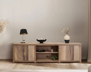 Take your living room to the next level with the Natural Parota TV stand, featuring a middle shelf and closed storage on both sides for your media essentials or décor, whether in your living room or bedroom. The boxy wood frame creates an overall timeless elegance, effortlessly enhancing the aesthetic of any room.Read More